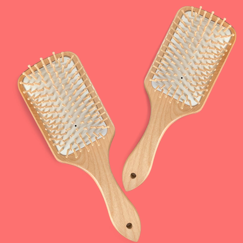 Cepillo ecológico en madera y cerdas de bambú, diseñado para cuidar tu cabello de forma natural.