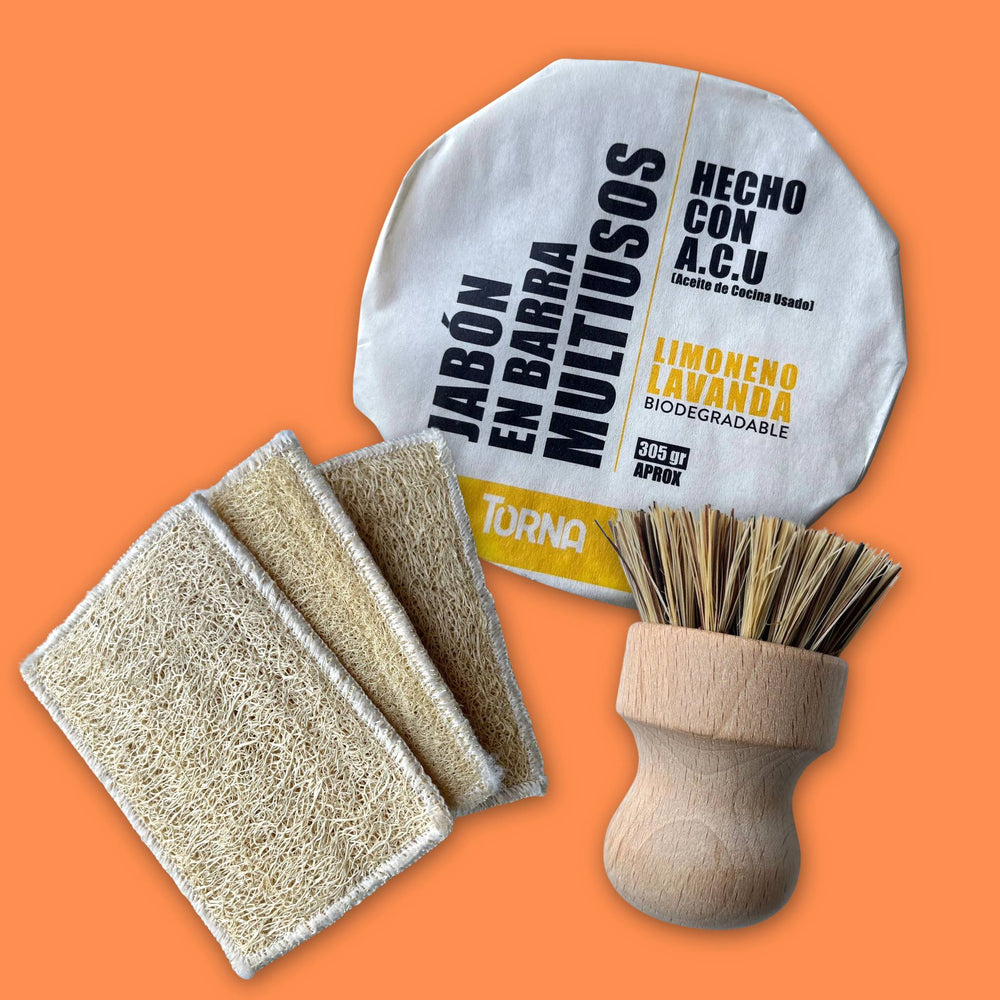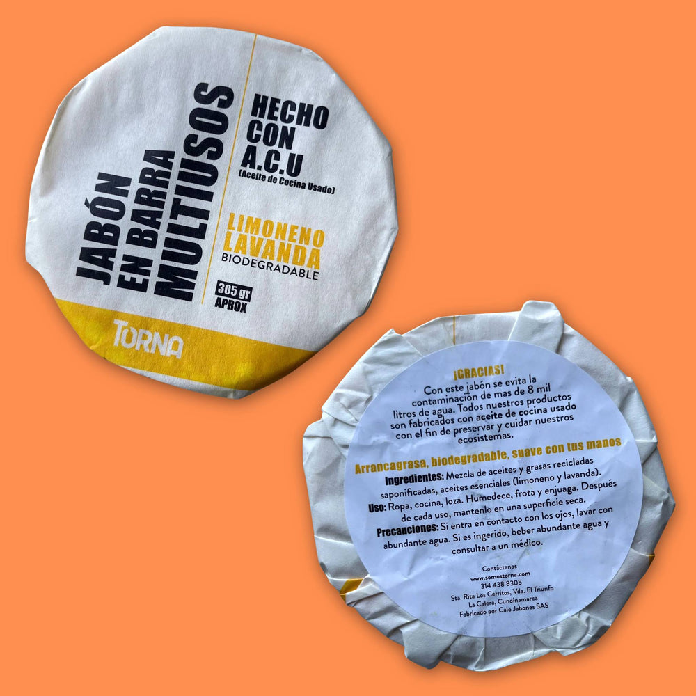 Jabón Torna: Colócalo en un recipiente que ya tengas en tu hogar y úsalo como repuesto de jabón lavaloza. Humedece la esponja, frota y enjuaga. Puedes utilizarlo en ropa, loza, pisos o cualquier superficie de hogar.