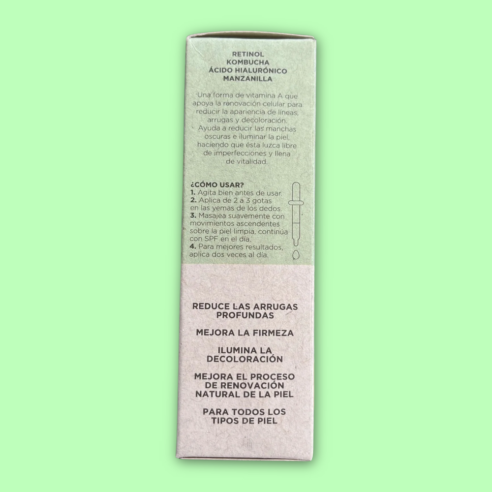 El Serum Revitalizante, Retinol, Kombucha y Ácido hialurónico. Ayuda a mejorar la apariencia de la piel gracias al alto contenido de ingredientes y vitaminas naturales.