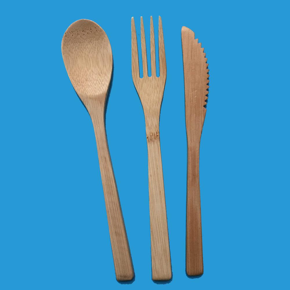 El Set de Cubiertos en Madera de Bambú, tiene Cuchillo, Tenedor y Cuchara.